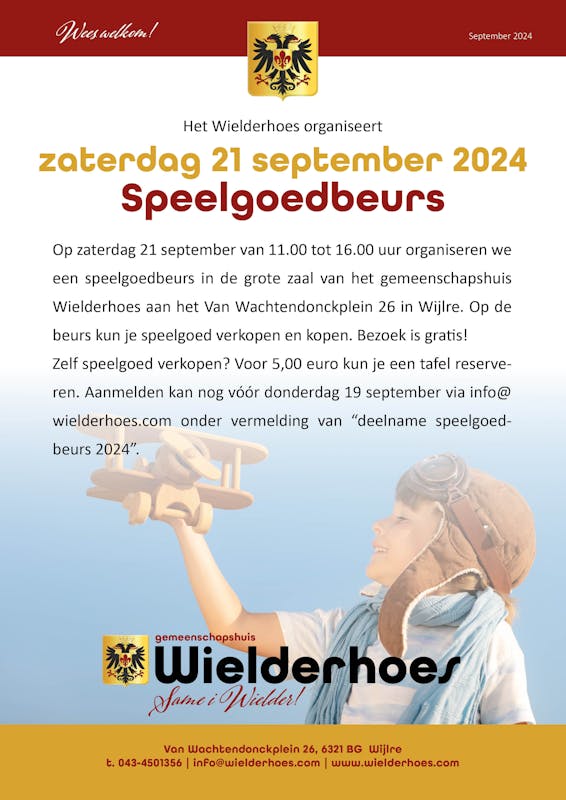 Op zaterdag 21 september van 11.00 tot 16.00 uur organiseren we een speelgoedbeurs in de grote zaal van het gemeenschapshuis Wielderhoes aan het Van Wachtendonckplein 26 in Wijlre. Op de beurs kun je speelgoed verkopen en kopen. Bezoek is gratis!