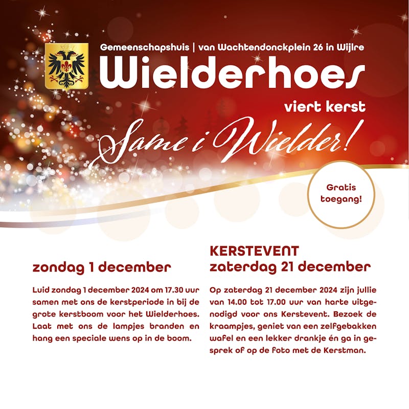 Wielderhoes komt in kerststemming. We heten jullie van harte welkom tijdens ons eerste kerstevent op zaterdag 21 december. “Same i Wielder”… we wensen iedereen een mooie tijd.
