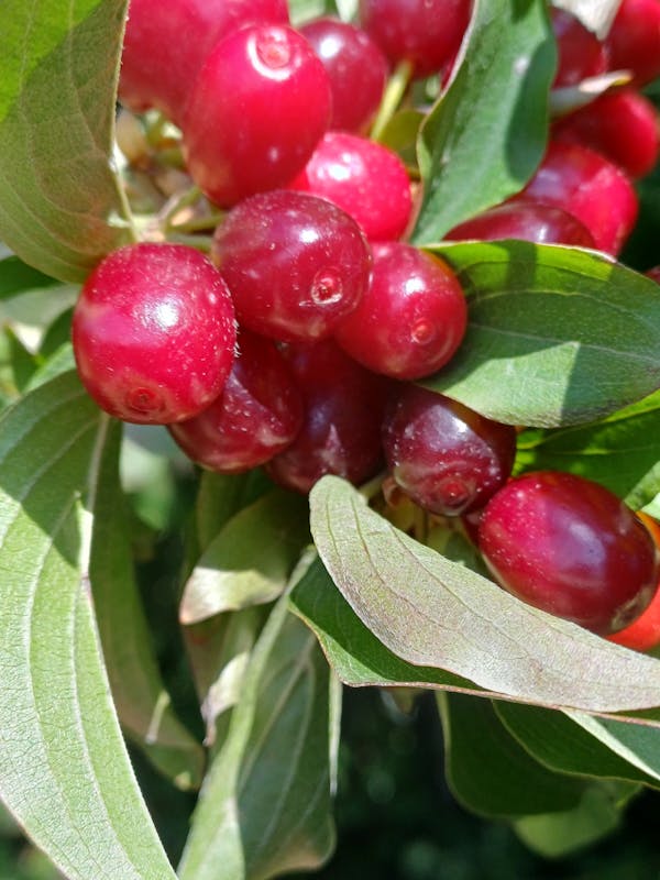 Foto: de eetbare rode bessen van de gele kornoelje (Cornus mas)