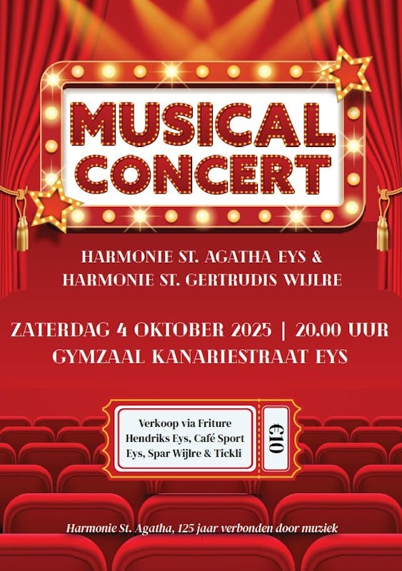 Harmonie St. Agatha Eys en harmonie St. Gertrudis Wijlre geven op zaterdagavond 4 oktober een Musicalconcert. Met een groot harmonieorkest en zang door Joline Soomers wordt het genieten van vele muzikale hoogtepunten uit bekende en soms minder bekende musicals.