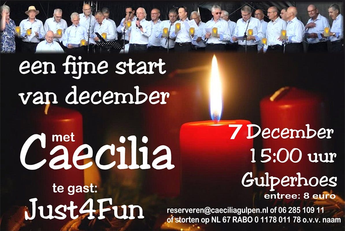 Zondag 7 december om 15:00 uur geeft mannenkoor Caecilia in het Gulperhoes in Gulpen haar jaarlijkse 'sfeerconcert'. Ze luidt daarmee traditioneel de feestmaand in, de tijd van warmte, gezelligheid, feest, familie, bij elkaar zijn.