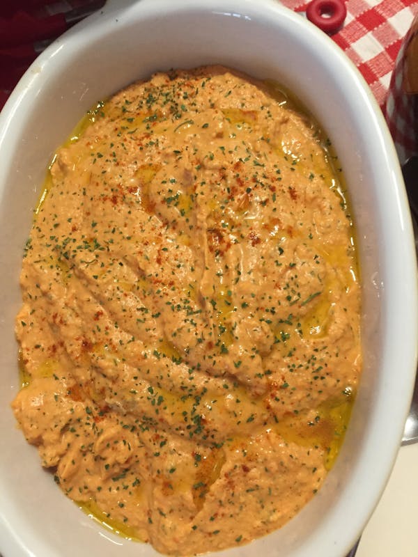 Ter variatie: maal met de humus geroosterde paprika mee. Het recept van geroosterde paprika volgt op een ander moment. De foto van de paprika-hummus vindt je helemaal onderaan.