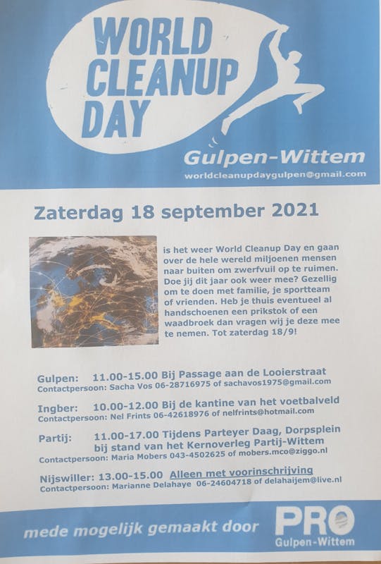 Tijdens de World Cleanup Day op 18 september gaan over de hele wereld miljoenen mensen naar buiten om samen zwerfvuil op te ruimen. Doe jij dit jaar ook weer mee? Gezellig om te doen met je sportteam, familie en vrienden. Heb je thuis eventueel al materialen zoals een prikstok, waadbroek of handschoenen gelieve deze dan mee te nemen.