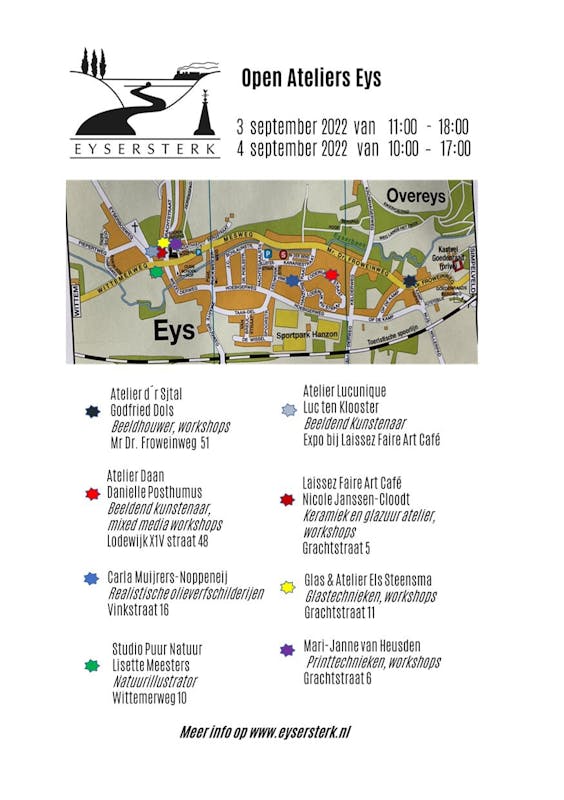 Kom en proef o.a. de sfeer en het werk van 8 verschillende kunstenaars in Eys! De deuren gaan open bij schilderateliers, een glasatelier, en een brons- en een keramiek atelier! U bent van harte welkom! Ook is het mogelijk zelf aan het werk te gaan op een paar locaties, dus trek je creatieve schoenen aan en kom! Je bent van harte welkom !