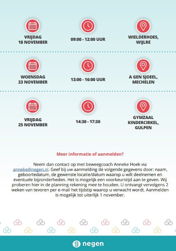 Neem dan contact op met beweegcoach Anneke Hoek via . Geef bij uw aanmelding de volgende gegevens door: naam, geboortedatum, de gewenste locatie/datum waarop u wilt deelnemen en eventuele bijzonderheden. Het is mogelijk een voorkeurstijd aan te geven. Wij proberen hier in de planning rekening mee te houden. U ontvangt vervolgens 2 weken van tevoren per e-mail het tijdstip waarop u verwacht wordt. Aanmelden is mogelijk tot uiterlijk 1 november.