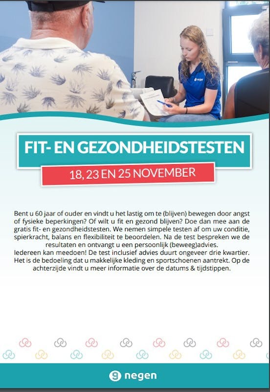 We nemen simpele testen af om uw conditie, spierkracht, balans en flexibiliteit te beoordelen. Na de test bespreken we de resultaten en ontvangt u een persoonlijk (beweeg)advies. Iedereen kan meedoen! De test inclusief advies duurt ongeveer drie kwartier. Het is de bedoeling dat u makkelijke kleding en sportschoenen aantrekt.