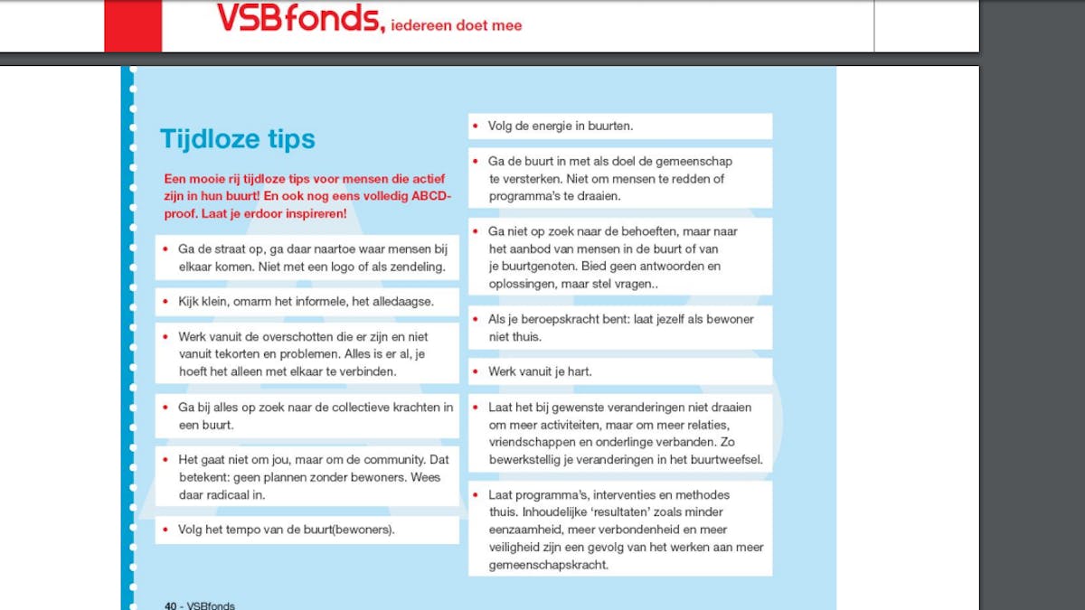 Klets met je buren en dorpsgenoten over dat wat er is, wat er allemaal voor goeds is, waar ze goed in zijn, wat ze graag zouden willen, ........ . Focus je dus op het goede. Het maakt niet uit of het iets kleins of groots is. Maak het zichtbaar. Deel het op Halloheuvelland. Dit kan anderen inspireren en misschien ontstaat er een geweldig initiatief, activiteit. De D van ABCD is van DOEN. Dus activiteiten (groot of klein) met elkaar ondernemen.