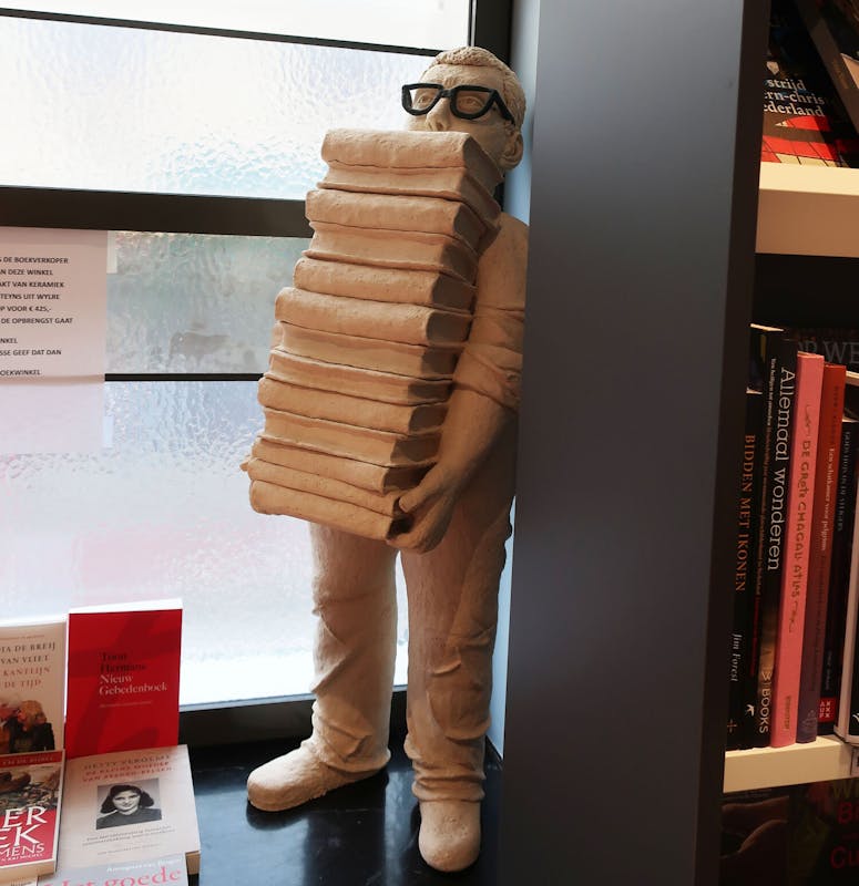 Vandaag kreeg boekhandelaar Gerard Prickaerts van de kloosterboekwinkel een mooi cadeau voor in zijn winkel: de boekverkoper. De boekverkoper is een beeld van keramiek van meer dan een halve meter hoog, gemaakt door Huub Steyns uit Wijlre. Het staat in de boekwinkel, maar niet om daar heel lang te blijven want het is te koop: voor 425 euro. De helft van dat bedrag is voor Wereldwinkel Wittem.