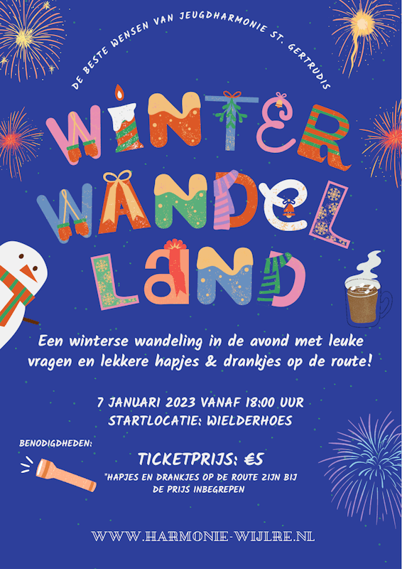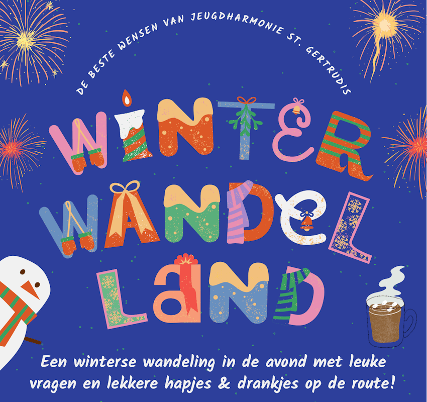 Op zaterdag 7 januari zal jeugdharmonie St. Gertrudis "Winter-wandel-land" organiseren. Hierbij kunt u in de avond een wandelroute van 5,5 km lopen met leuke vragen en opdrachten tussendoor. Onderweg zult u ook op meerdere locaties heerlijke winter hapjes en drankjes krijgen.