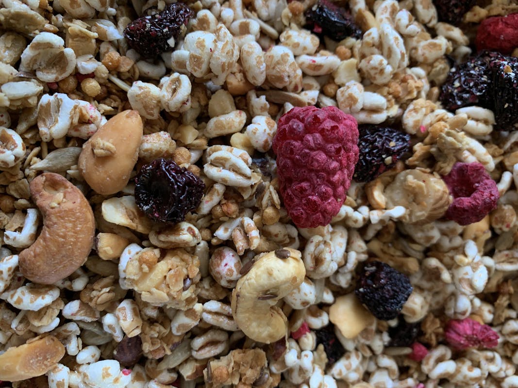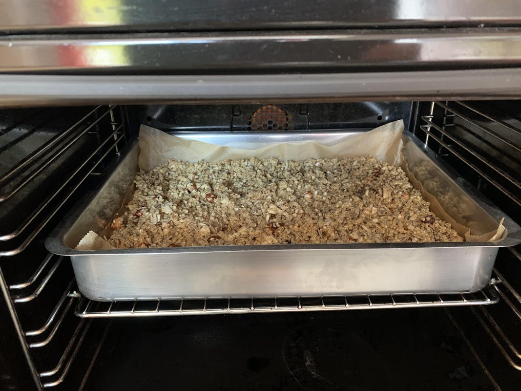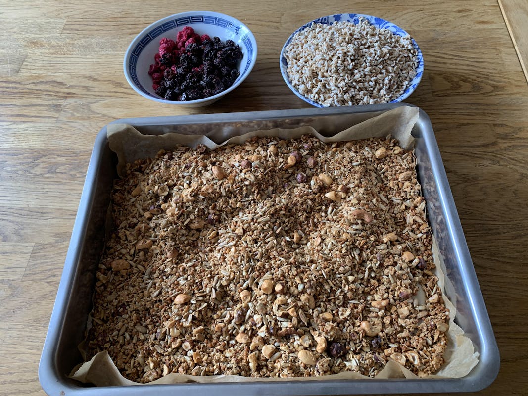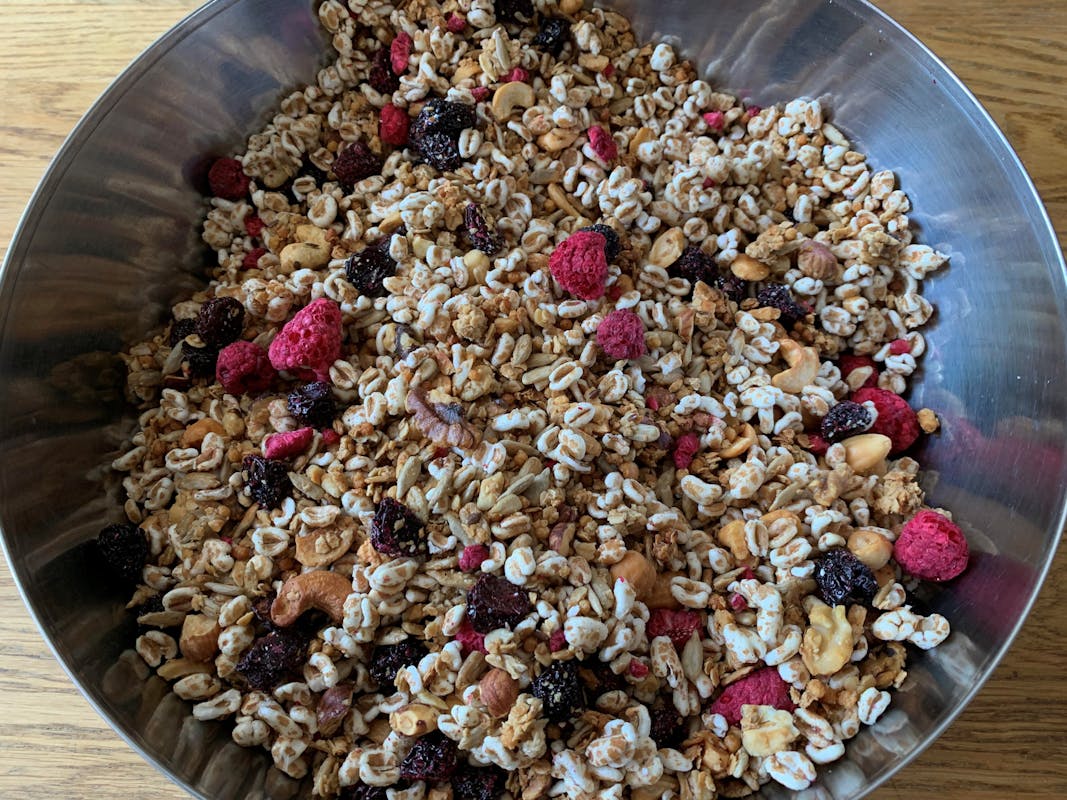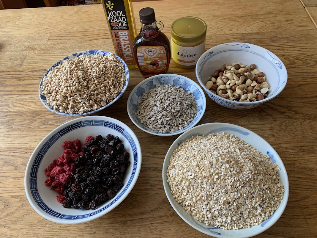 Uit de oven halen en laten afkoelen. Als het afgekoeld is het gedroogde fruit en de gepofte spelt erdoor mengen.