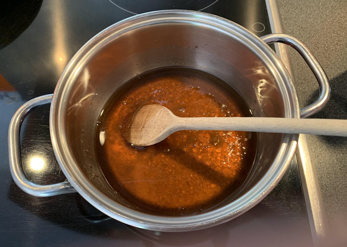 Verwarm de honing, koolzaadolie, ahornsiroop en water in een pannetje.