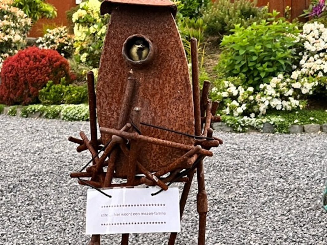 Met glinsterende ogen en een grote glimlach op hun gezicht wandelden kunstliefhebbers en toevallige bezoekers door ons huis en de tuin waarbij er veel complimenten over de getoonde kunstwerken werden uitgedeeld. Ook de tuin oogstte veel bewondering, maar de kers op de taart was toch het vogelhuisje waarin een mezen-echtpaar in en uit vloog om hun jongen te voeren. Ze trokken zich niets aan van de rij mensen die vaak slechts op een afstand van nog geen meter het gedoe stonden te bekijken.