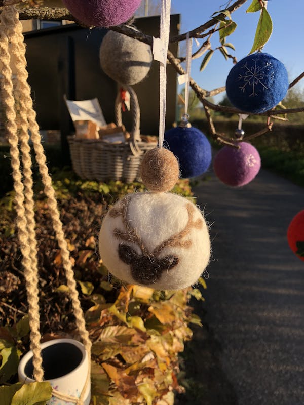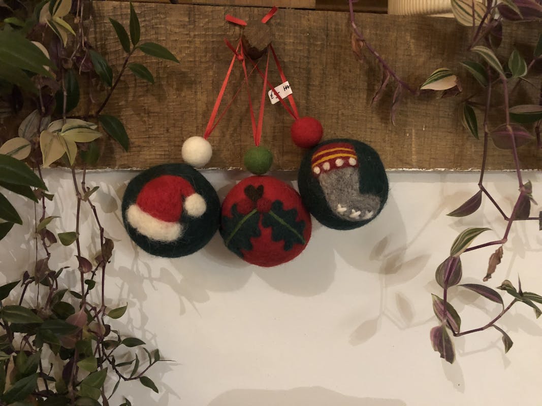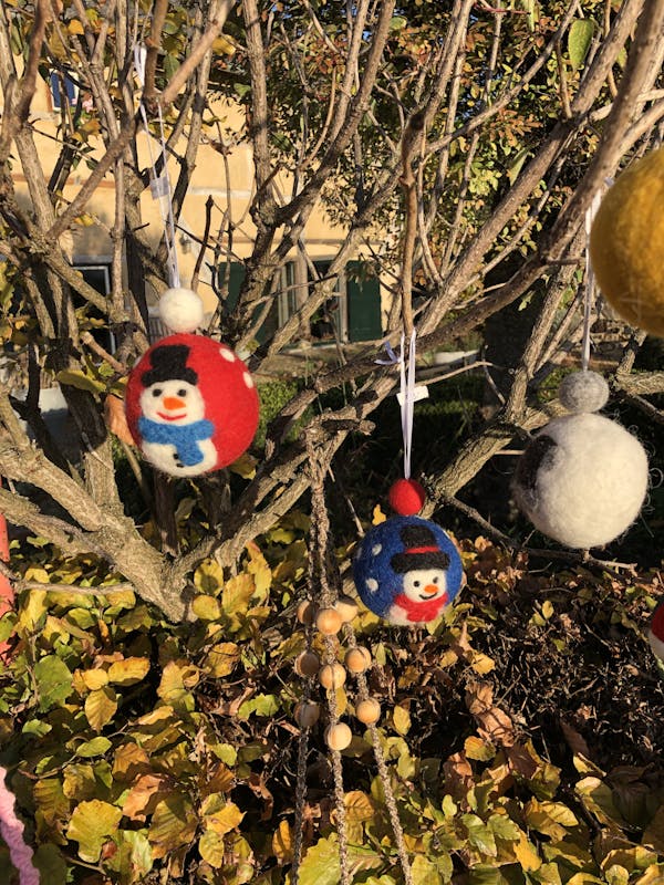 Ze zijn er weer mijn handgevilte kerstballen van wol. Ik maak ze in verschillende kleuren en met diverse voorstellingen. Bij droog weer hangen ze in de vlierstruik naast mijn winkelkastje.