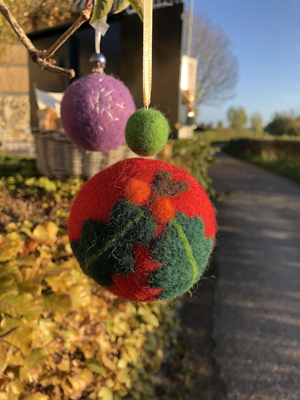 Mocht je het leuk vinden zelf een kerstbal te vilten dan kun je jezelf aanmelden voor een workshop vilten. Deze workshop duurt 2,5 uur en kost 25 euro per persoon inclusief materiaal en koffie en thee met iets lekkers.
