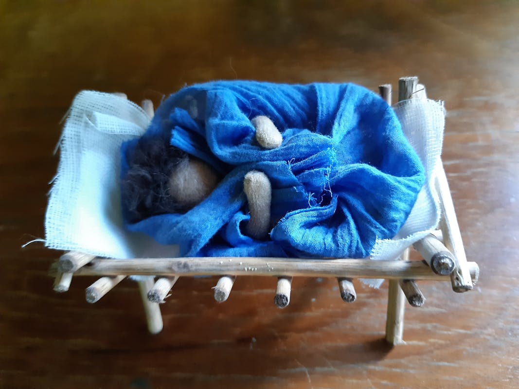 “Mijn moeder heeft van wat wol een poppetje gemaakt en dat erin gelegd. Heel klein, kijk zo.”