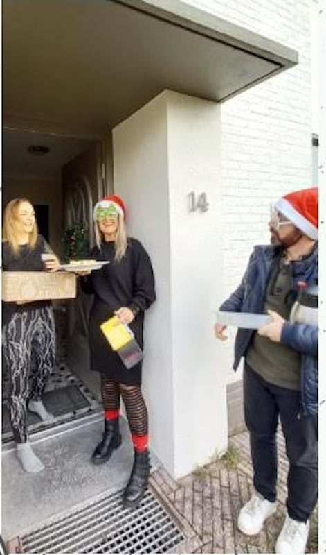 Zondag werd er aangebeld en een speciaal ingevlogen bezorgtrio, de kerstvrouw en de kerstmannen van frituur-restaurant de Krieëkel, stonden voor de deur om zo hun medewerkers te bedanken. Met glühwein en kerststol werd samen getoast op een beter jaar 2021. Super leuk gedaan.
