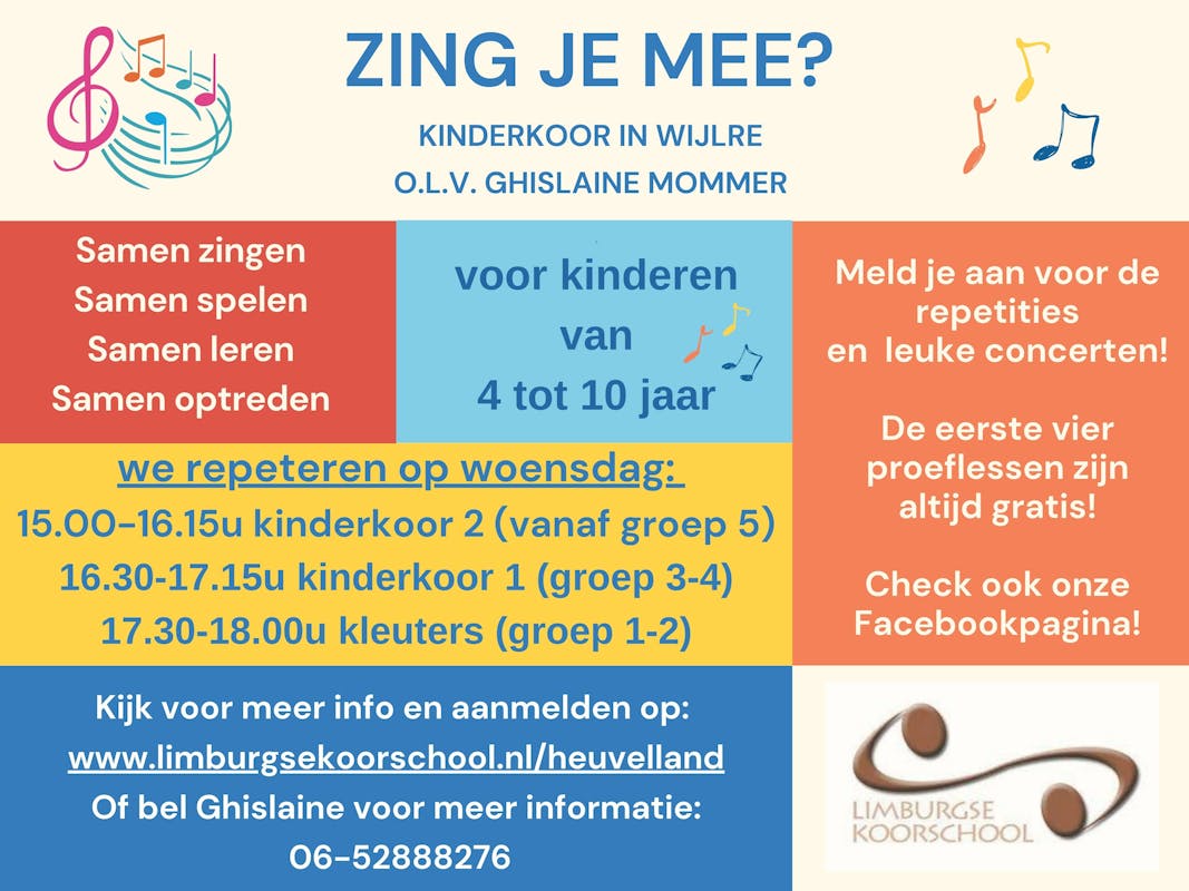 Zingt jouw (klein)kind ook zo graag? Maak dan kennis met het kinderkoor van de Limburgse koorschool! Voor kinderen van 6-9 jaar op woensdagmiddag. En: bij voldoende aanmelding starten we een nieuwe groep speciaal voor kleuters (groep 1-2). Kijk voor meer info en aanmelding op: www.limburgsekoorschool.nl/projecten/heuvelland. De eerste vier lessen zijn gratis.