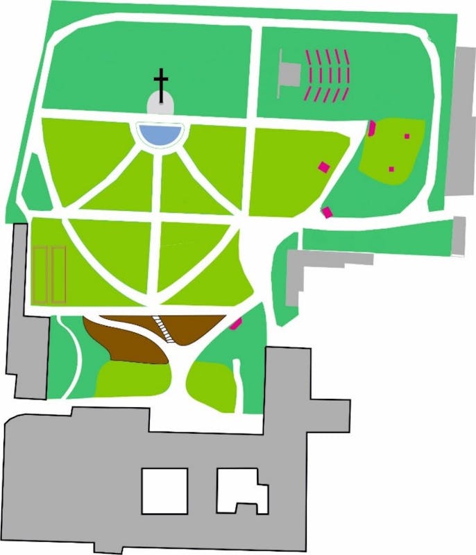 Direct achter dit beeld van Maria is links het strooiveld. Veel mensen vinden troost dat de as van hun dierbare hier is uitgestrooid en zijn of haar naam hier een plekje heeft. Een naam is betekenisvol. Jesus' naam betekent: Redder of God Redt.