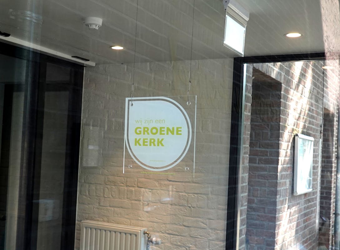 Aan het begin van de 'Maand van de Schepping' - uitgeroepen door paus Franciscus - is in de nieuwe ingang van Klooster Wittem een bordje opgehangen met het opschrift Groene Kerk.