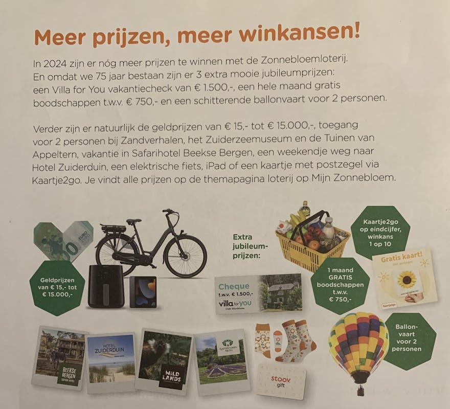 Vanaf 1 juni komen de vrijwilligers van Zonnebloem Epen bij u aan de deur voor de lotenverkoop. Ze kosten € 3,- per stuk, waarvan € 2,25 naar de zonnebloem Epen gaat. Er zijn mooie prijzen te winnen. De hoofdprijs is € 15.000. Dit jaar zijn er meer prijzen en kansen omdat de Zonnebloem haar 75-jarige jubileum viert. Dus doe vooral mee! Zie voor alle prijzen www.zonnebloem.nl/loterij.