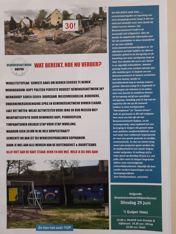 Dinsdag 29 juni a.s. van 19.30 uur (inloop vanaf 19.00 uur) tot omstreeks 22.00 uur, is er weer een bijeenkomst van het Bewonersnetwerk Gulpen in 't Gulper Hoes in Gulpen. E...