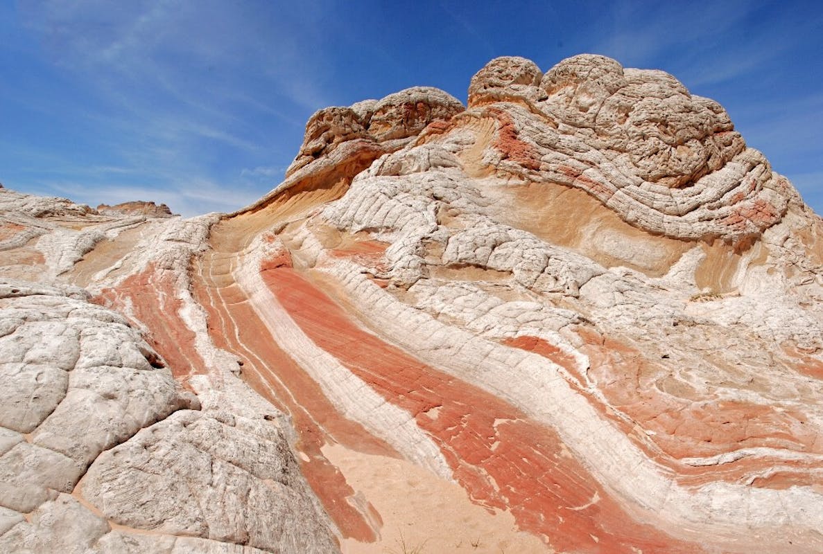 WHITE POCKET was voor ons onbekend terrein en op eigen houtje niet bereikbaar. Verzin ze maar … etiketten als ongewoon, zonderling, verrassend, vreemd, grillig en bizar of onaards mooi. Welke benamingen je ook bedenkt, ze passen het verbazingwekkende gebied dat WHITE POCKET wordt genoemd, als een handschoen. Je hebt een permit nodig om er naartoe te gaan, maar zelfs als je die hebt zal het gebied zich schuil houden voor iedereen die niet weet hoe en op welke manier je er moet komen. De dag die we daar met fotograaf Terry Alderman doorbrachten was een ‘one-of-a-kind’ ervaring.