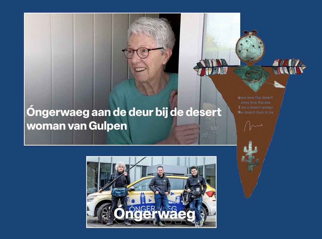 Ze kunnen zomaar bij je aanbellen, de mannen van het programma Óngerwaeg, onder aanvoering van Bas van der Zwaan, de journalist/vragensteller van L1. Op hun rondgang door Limburg worden ze getriggerd door iemand of iets wat hun nieuwsgierigheid prikkelt. In dit geval was het mijn kunstwerk ‘Desert Woman’ dat aan ons huis is bevestigd en met name de tekst die daarin is aangebracht. Wat volgt is een interview dat in twee afleveringen op L1 te zien was.