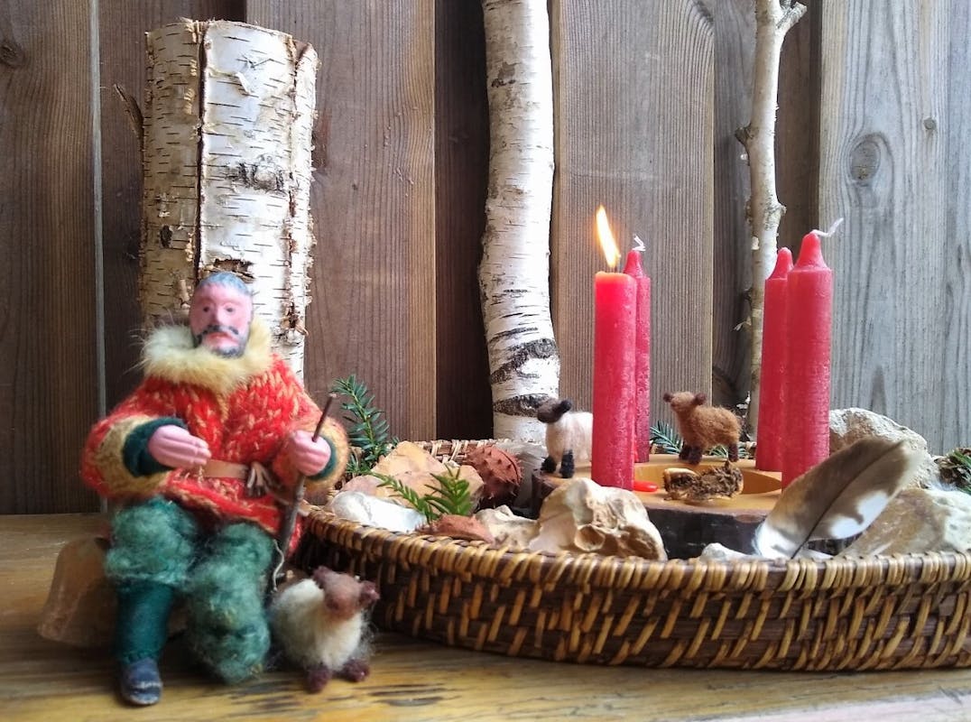 Voor mij was de wandeling in het schitterende avondlicht met mijn geliefden en mijn trouwe hond een warm, intiem samenzijn in ons mooie Heuvelland, mijn onverwachte surprise! Pas 's avonds na hun vertrek besefte ik dat het eerste adventszondag was, ik pakte een van de dozen waarin ik mijn kerstherinneringen bewaar, nam mijn kleine houten adventskrans eruit en stak de eerste adventskaars aan. In die doos ligt ook in een mooi doekje gewikkeld de 'Herder oet de Krisstjal van mien pap en mam' . Hij is me zeer dierbaar, zo'n zestig jaar oud en net zoals de kerstfiguren van de ouders van Ceciel van het RuilWinkeltje Epen bijzonder omdat er zoveel mooie herinneringen aan verbonden zijn. In deze herder zie ik mijn ouders, hun altijd bezige handen, thuis met hun levendig gezin, in de tuin, op hun werk. Aan de hand namen ze ons mee de bossen, het veld in, de liefde voor de natuur heb ik van mijn ouders meegekregen. Die twee paar handen hebben ook heel wat creatieve werkstukken voorgebracht, om nog even in Sinterklaassfeer te blijven, ze maakten veel cadeaus zelf. Pap maakte van hout een poppenhuis, winkeltje, een garage voor hun zoon, mam maakte kleertjes voor de poppen van hun zes dochters, richtte het poppenhuis, winkeltje in en nog zoveel meer. En dat gebeurde vrijwel allemaal in de avonduren of een zeldzaam uurtje overdag. Jarenlang zelfs toen de meeste kinderen al het huis uit waren gevlogen werden we op pakjesavond in ons oudershuis verrast met surprises en cadeautjes gemaakt door hun creatieve handen. Deze herder hebben ze samen gemaakt net zoals de andere kerstfiguren oet de Krisstjal. Pap heeft het draadwerk, het gipsen hoofd, de handen en voeten gemaakt, mam heeft de herder aangekleed. Ik zie net als Ceciel de herder nog thuis onder de boom staan geknield voor het Kribke met zijn schaapjes. Ik heb hem naast mijn kleine adventskrans en boeken met kerstverhalen neergezet op eerste steen die ik in het Klingendal heb opgeraapt toen ik maart 2017 in het Heuvelland kwam wonen. De herder en ik gaan samen op zoek naar de vele lichtjes die wie zeker zullen tegenkomen in deze adventstijd en langzaam maar zeker vinder de kerstherinneringen hun plekje in mijn huis.