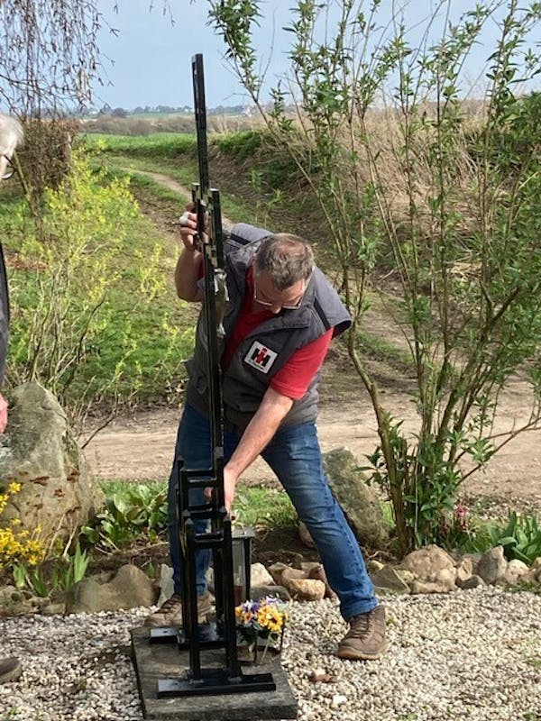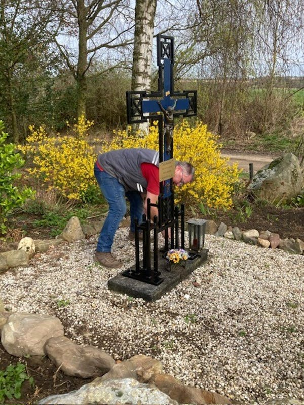 Wie is de vrijwilliger die dit hier zo liefdevol heeft gedaan? Dat is Ger Huynen. De kruisjes in Mechelen worden bijgehouden door adoptanten van zo’n kruisje. De Heemkundevereniging Mechelen houdt bij wie dat zijn en wat de achtergrond van zo’n kruis is. Via de st. Dorpsbinding Mechelen kwam Ger in beeld. Hij wilde graag een handje toesteken en met een financiële bijdrage van de gemeente kwam van het een het ander. Mooi dat op deze manier een voor velen belangrijk landschapskenmerk blijft bestaan.