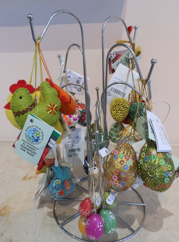 Wereldwinkel Wittem geeft in april 10% korting op alle paasartikelen: prachtig versierde eieren (meestal van hout) om in een voorjaarstak te hangen. Grappige kippetjes of haasjes om een paasbruchtafel te versieren.