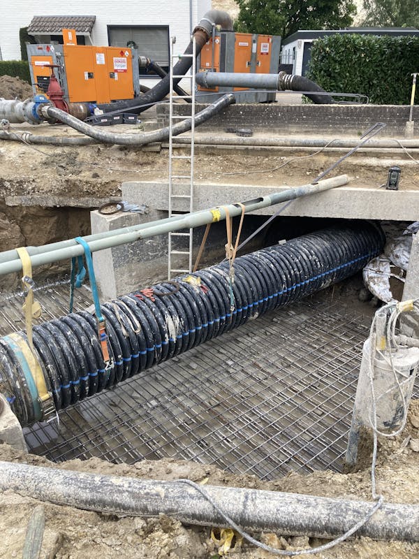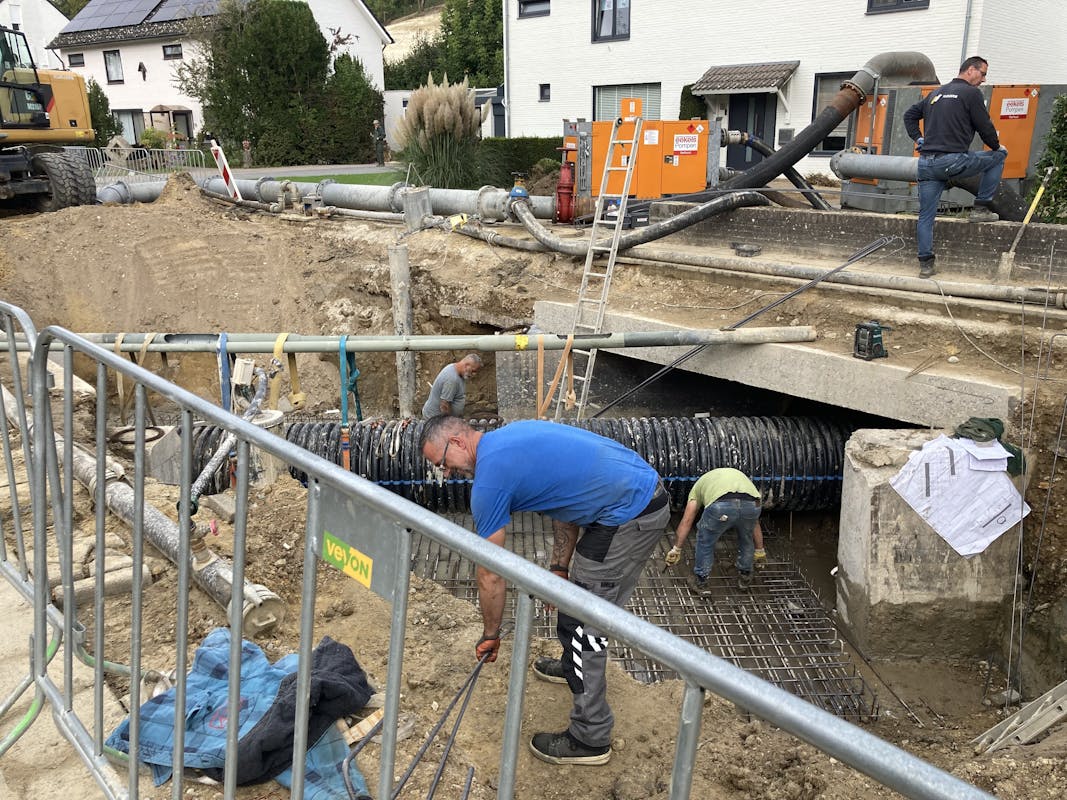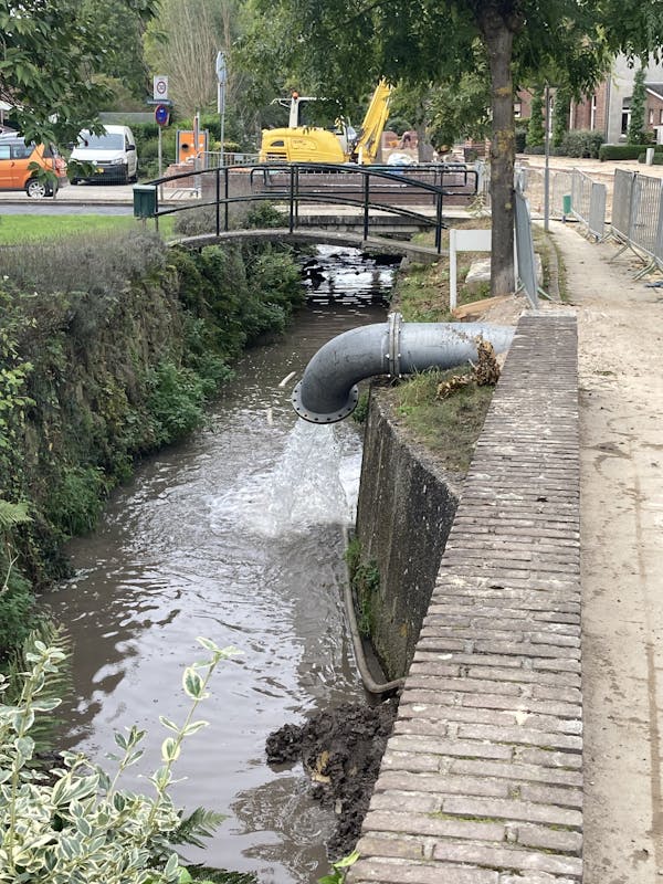 Spannende werkzaamheden aan de Mesweg in Eys. De brug over de Eyserbeek wordt vernieuwd. Daarom wordt het water weggepompt. De pompen geven overlast voor de bewoners en daarom wordt het water via een tijdelijke buis afgevoerd. Die buis wordt vandaag in gebruik genomen. Dan kunnen de pompen uitgeschakeld worden.Tevens wordt vandaag de vloer van de beekbodem onder de brug vol beton gestort.