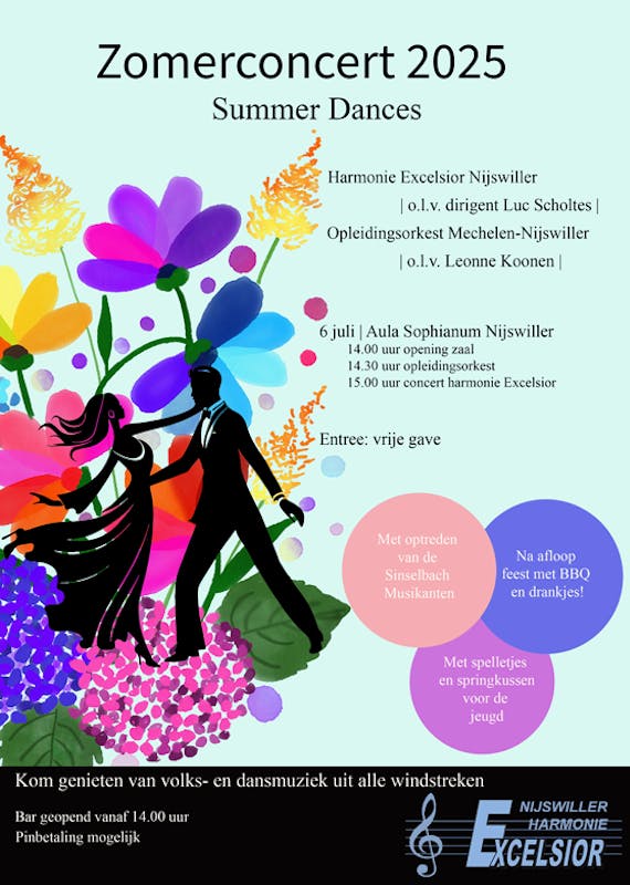 Op zondag 6 juli a.s. houdt Harmonie Excelsior haar inmiddels traditionele zomerconcert als afsluiting van het muzikale jaar. Dit jaar met als thema “Summer Dances” waarbij wij een pallet aan diverse muzikale klanken ten gehore zullen brengen, van traditionele volksdansen tot moderne werken.