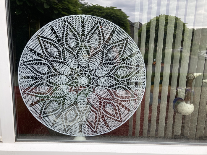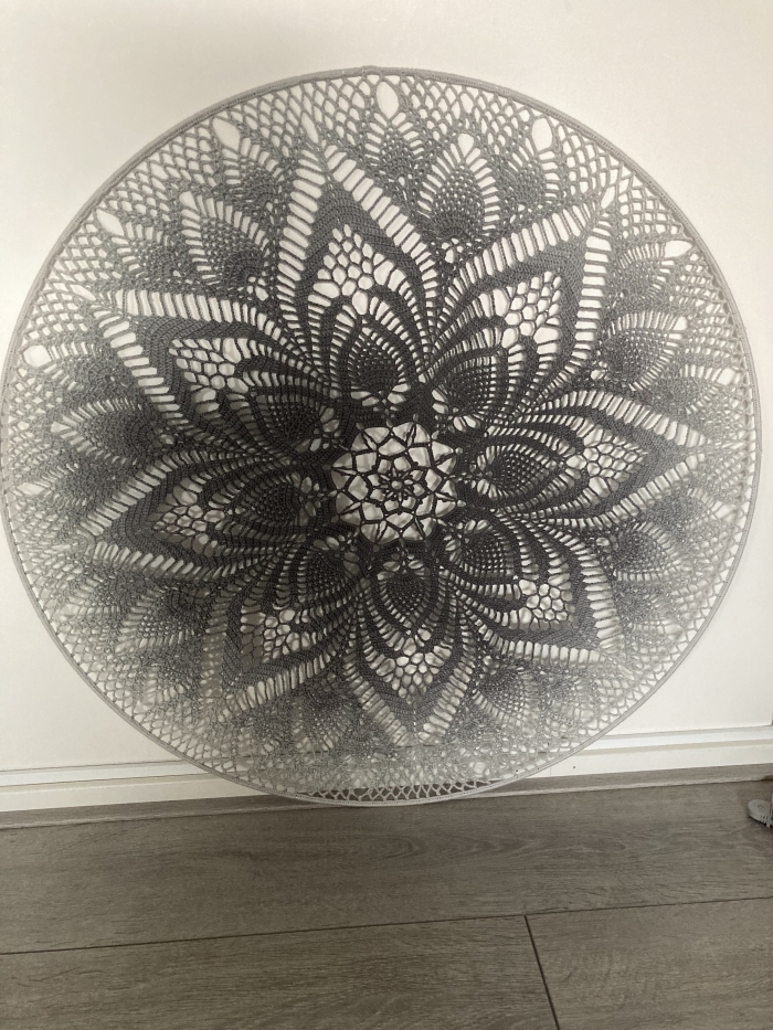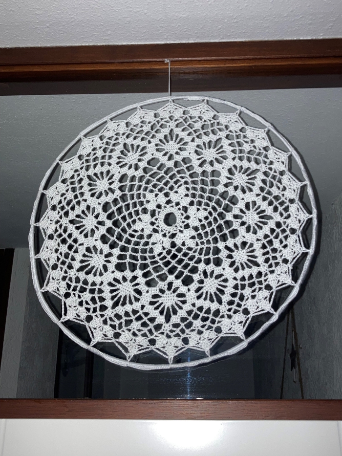 In ring van 50 cm. Wit katoen 75 gram gebruikt ongeveer.(180m). Haaknaald 2,5